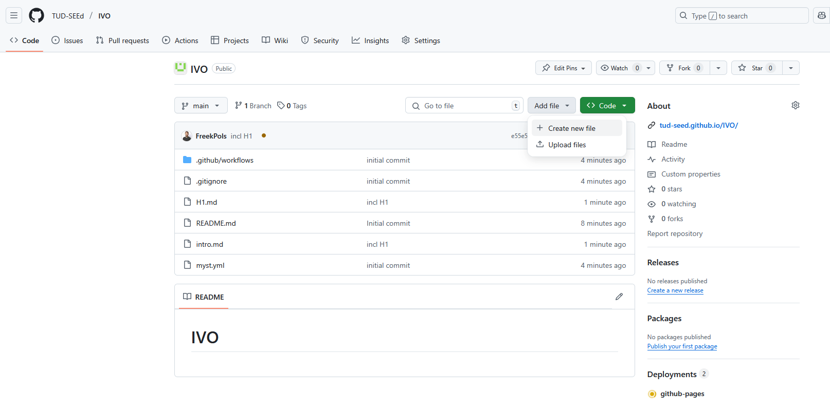 Ga naar de folder studentenwerk en klik op Add file en Create a new file, zie hieronder.