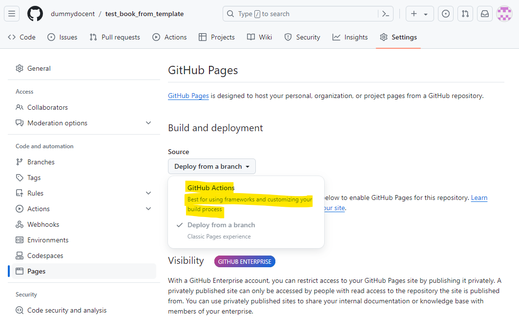 codeen klik op het tandwiel (bij About) aan de rechterkant van het scherm.Vink Use your GitHub Pages website aan.